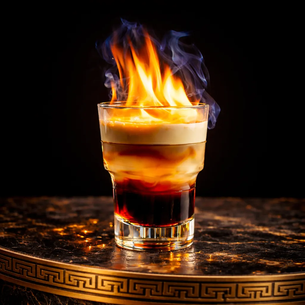 A drink worthy of legend—ignited before your eyes, with layers of deep, smoldering spirits and a velvety crest set ablaze. The flame awakens bold richness, unfolding into a smooth yet powerful finish—intense, captivating, and gone too soon.